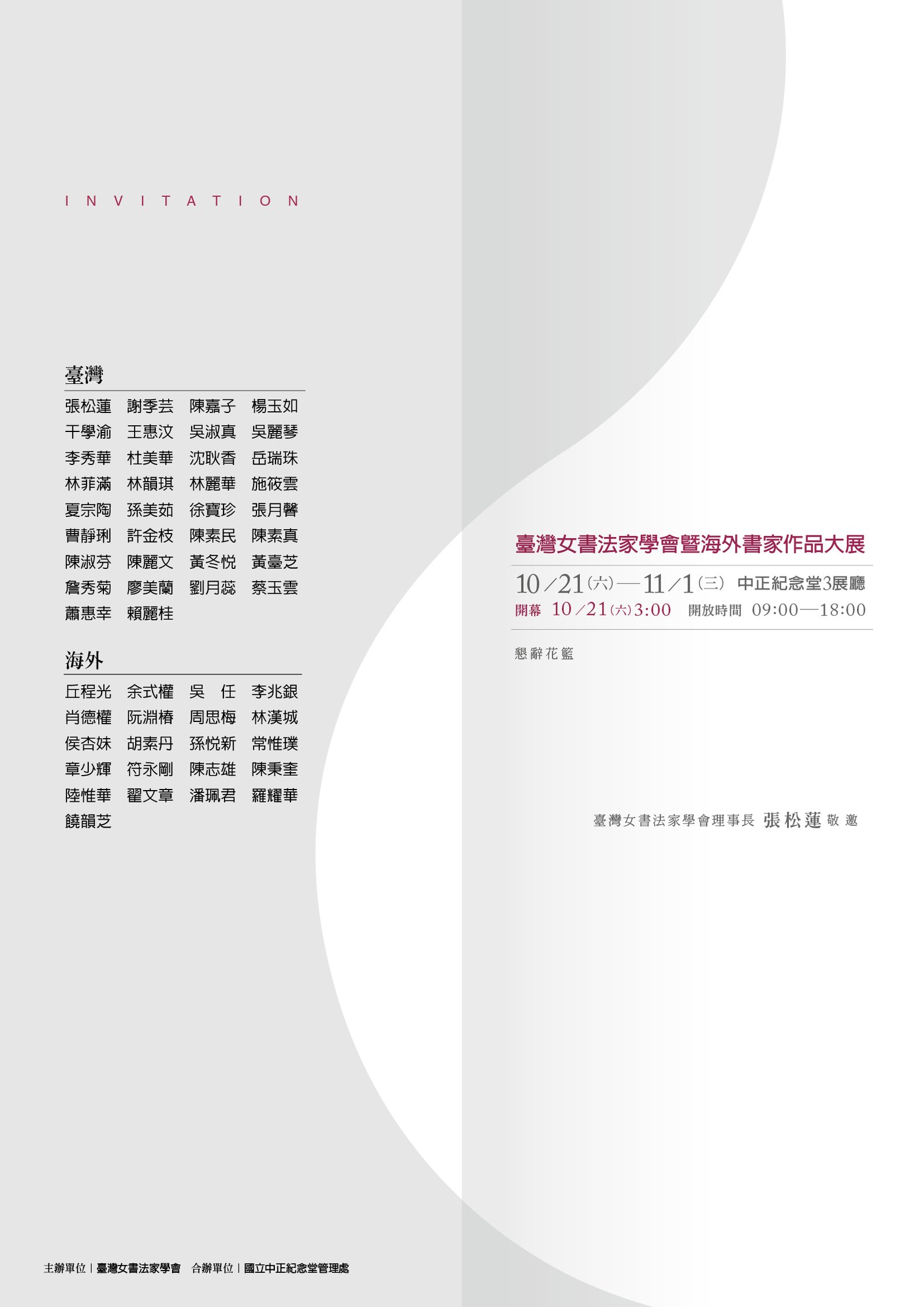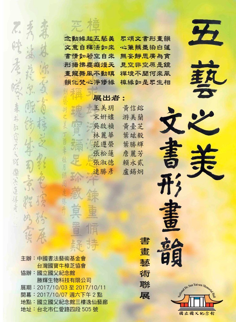 “墨舞乾坤”台湾女书法家学会与海外书家作品大展,2017年10月21日于台湾台北中正纪念堂3展厅隆重揭幕。此次邀请美国李兆银主席、罗耀华会长、翟文章主席、法国陈秉奎主席、比利时陆维华主席、侯杏妹主席、意大利肖德权主席、余式权顾问、捷克孙悦新委员、卢森堡章少辉主席、越南林汉城、新加坡丘程光主席、马来西亚符永光主席、印尼阮渊椿主席、胡素丹主席、饶韵芝主席、印度常惟璞主席、香港吴任主席、大陆陈志雄主席与周思梅女史共襄盛举。